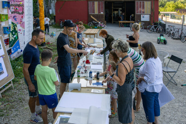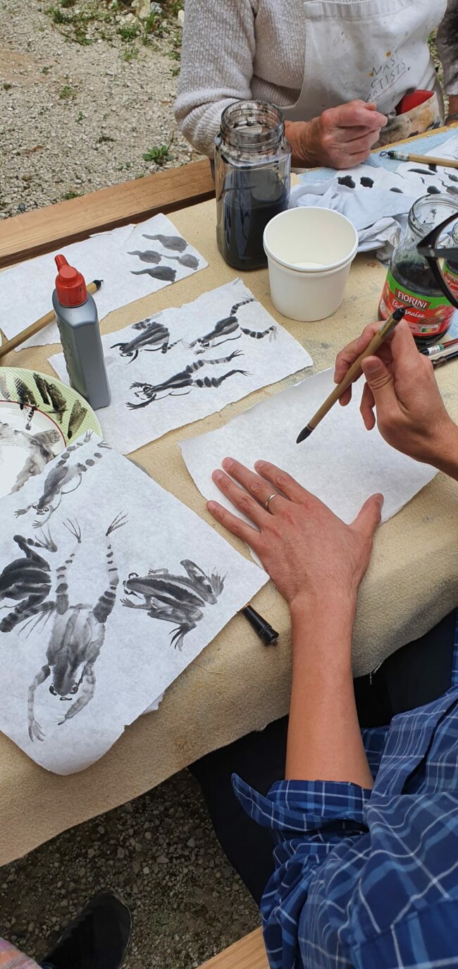 Atelier peinture chinoise et totems pour les petits du 28 juillet au 1er août Longjun et Antoine nous enseignent l’art de la peinture chinoise et de fabriquer des totems en bouteilles de plastique. D’eau évidemment ! Nous créons notre rû imaginaire peuplé d’animaux bizarres.